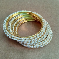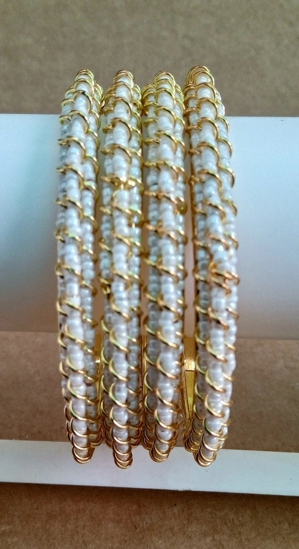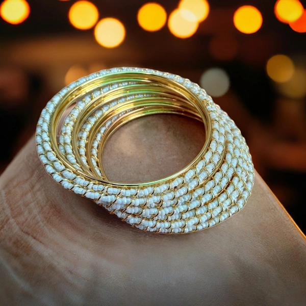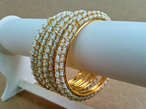 Enhance your outfit with these are “Stunning Fancy Bangles” Set of 4 adorned with vibrant White pearls. Perfect for adding a touch of elegance and sparkle to any ensemble, these bangles are versatile enough to be worn casually or for a special occasion. Made with high-quality materials, these bangles are sure to become a staple in your jewelry collection.