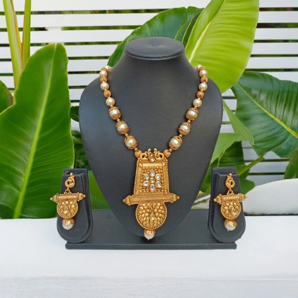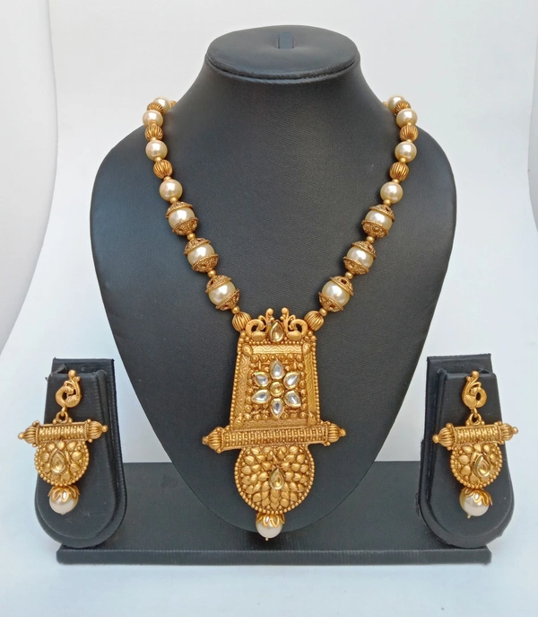 The matte finish often provides a vintage or antique feel, making it suitable for traditional occasions. The necklace set is plated with gold; enhancing its elegance and making it look like real gold jewelry without the high cost. Gold plating adds to the durability and luster of the necklace. High-quality artificial kundan are used, mimicking the appearance of real kundan. Pearls add a classic and sophisticated touch to the jewelry. Typically features a combination of artificial kundan work designed in an intricate pattern. Matching earrings often accompany the necklace,