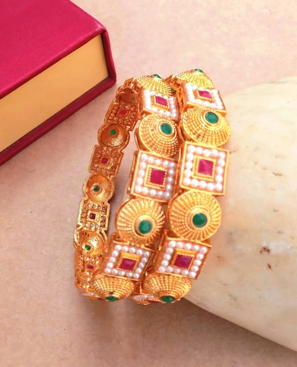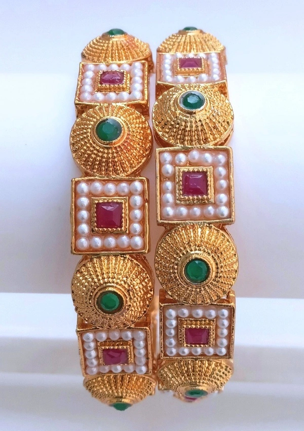 Royal Red & Green Kundan & White Pearl Metal Bangles kada Set.Set.