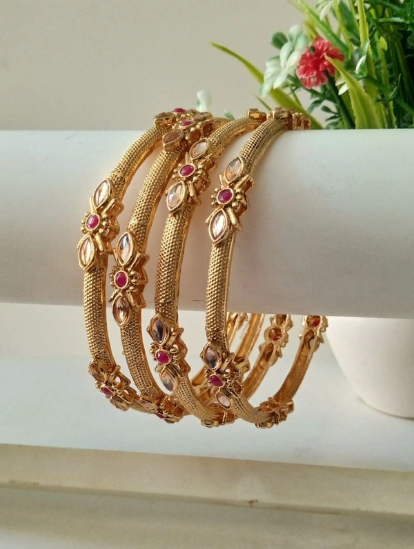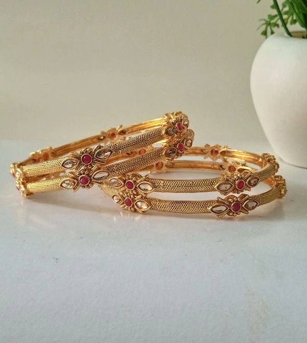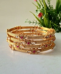 Indulge in the exquisite charm of our stunning gold-plated bangles, Crafted from high-quality brass and copper metal, these bangles not only exude luxury but also promise durability for everyday wear or special occasions. The intricate design features a harmonious blend of hues, allowing you to effortlessly pair them with any outfit, whether it be traditional or contemporary. Each bangle is meticulously designed to ensure a comfortable fit while making a bold statement on your wrist. Elevate your jewelry collection with these captivating bangles that are perfect for gifting or treating yourself to a touch of glamour.