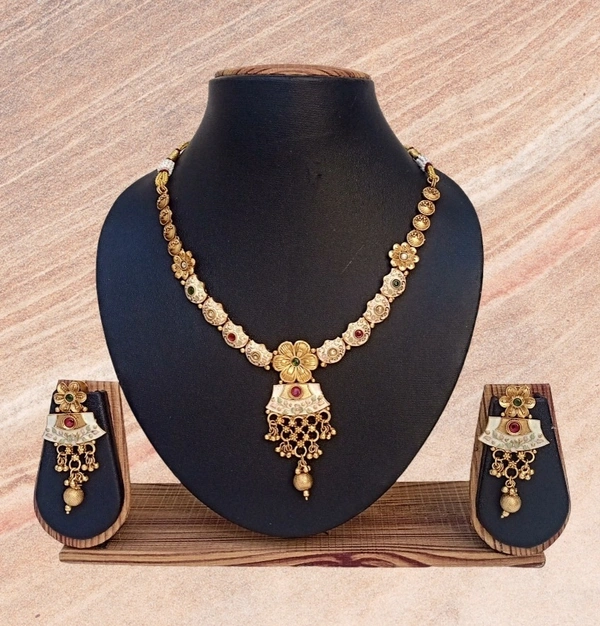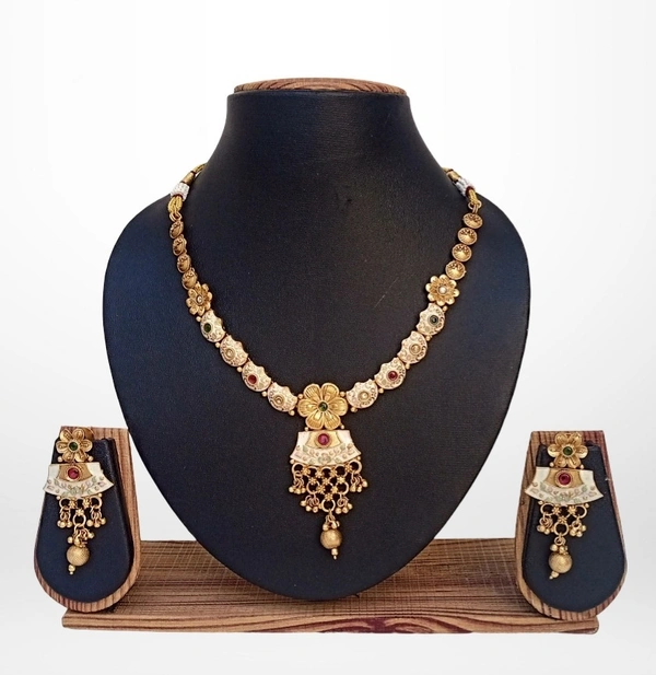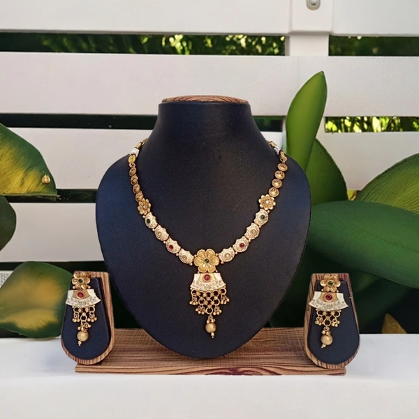 The matte finish often provides a vintage or antique feel, making it suitable for traditional occasions. The necklace set is plated with gold; enhancing its elegance and making it look like real gold jewelry without the high cost. Gold plating adds to the durability and luster of the necklace. High-quality artificial kundan are used, mimicking the appearance of real kundan. Pearls add a classic and sophisticated touch to the jewelry. Typically features a combination of artificial kundan and meenakari work designed in an intricate pattern. Matching earrings often accompany the necklace,