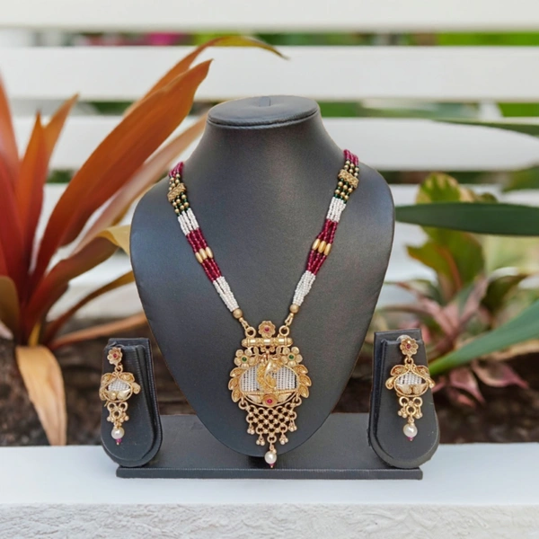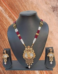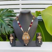 The matte finish often provides a vintage or antique feel, making it suitable for traditional occasions. The necklace set is plated with gold; enhancing its elegance and making it look like real gold jewelry without the high cost. Gold plating adds to the durability and luster of the necklace. High-quality artificial Kundan are used, add a classic and sophisticated touch to the jewelry. Typically features a combination of artificial kundan stones arranged in an intricate pattern. Matching earrings often accompany the necklace, featuring similar design elements with artificial kundan and pearls work. Has wearing for weddings, or festivals and other traditional events. Pairs well with traditional Indian attire like sarees, lehengas, suits, etc.