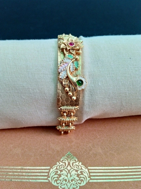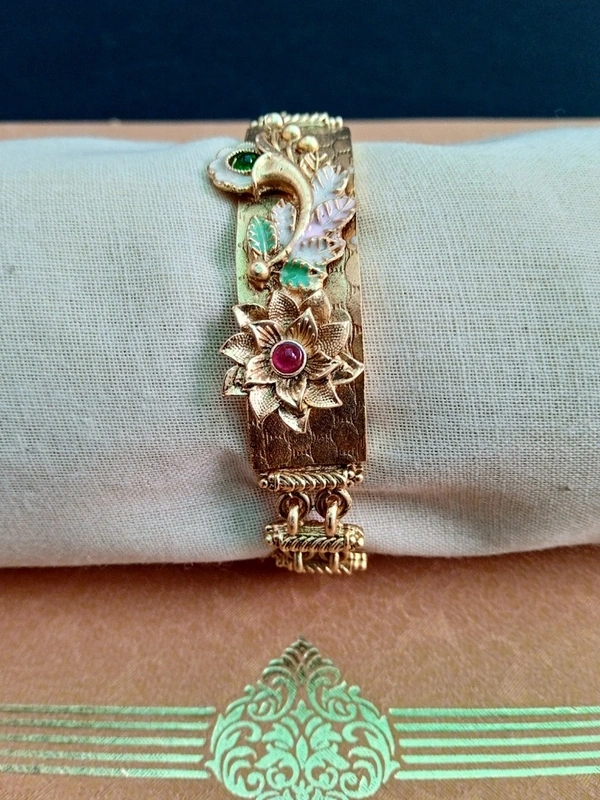 Indian Expert Goldsmith has crafted this Traditional Royal Bracelet Design. This beautiful bracelet is Matte finished high Gold Plated for a luxurious finish. Perfect for women and girls, it’s adding a touch of elegance and sophistication to any outfit. Elevate your style with this stunning place of jewelry.